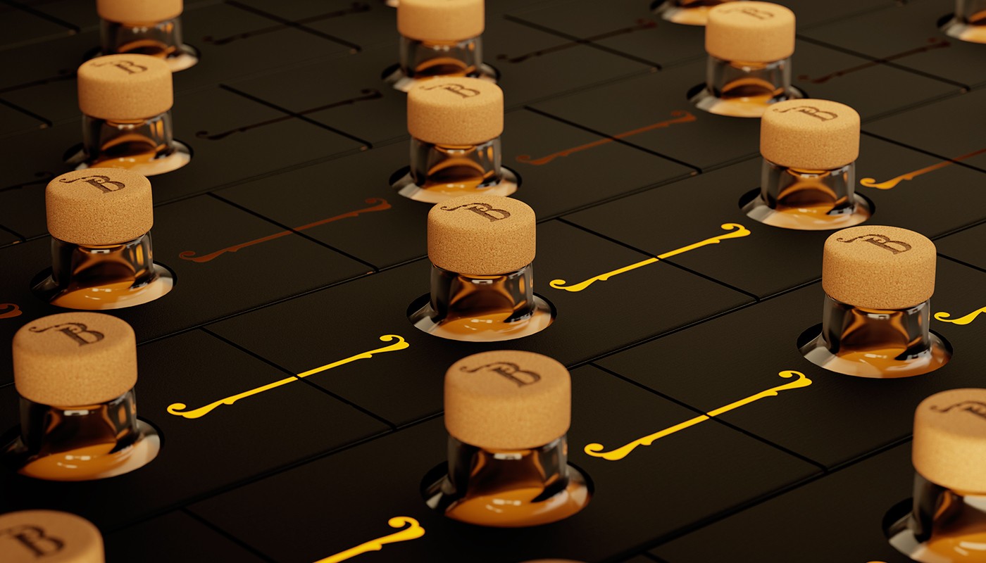 這種蜂蜜實(shí)際上有四種不同的類(lèi)型;酸木、麥盧卡、橘子和蕎麥。為了使每一個(gè)都與眾不同,我們決定給它們可識(shí)別的顏色;青銅色、金色、銀色和翡翠綠色(按順序排列)搭配閃亮的紫外線(xiàn),與前面蜜蜂烙印的黑色背景形成強(qiáng)烈對(duì)比,除了對(duì)這種生物的尊重之外,別無(wú)其他。