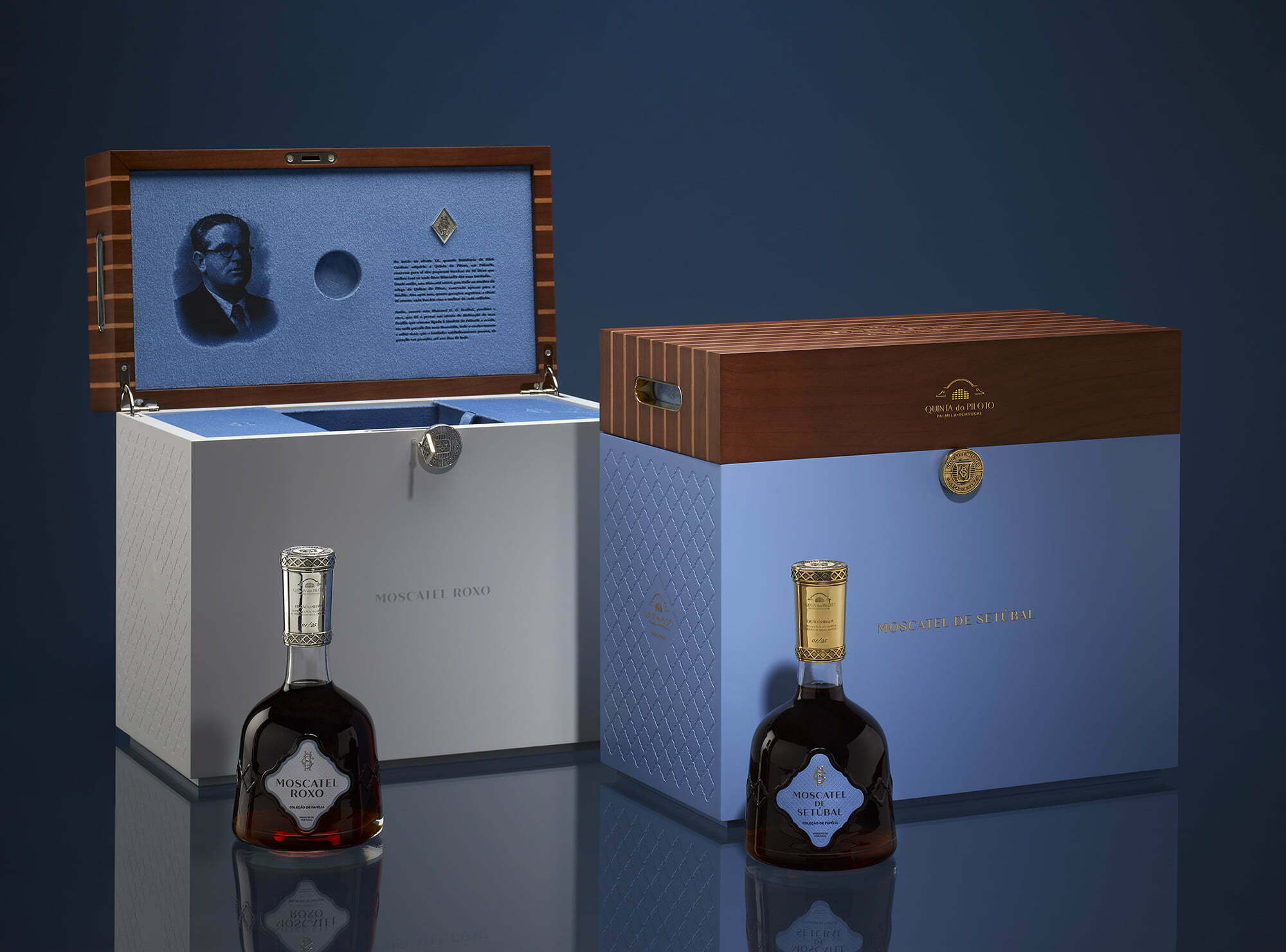 They are very exclusive wines that carry the legacy of four generations of Cardoso family in a chest that transports us on an authentic “journey through time”. This edition of only 25 bottles of each Moscatel is presented in two luxurious packaging and each one of them enhances the uniqueness of these “jewels” of Quinta do Piloto. They are a true ode to the past and a tribute to Humberto da Silva Cardoso, founder of this historic house on the Setúbal Peninsula, known throughout the world for its production of superior quality nectars and unparalleled Moscatéis.