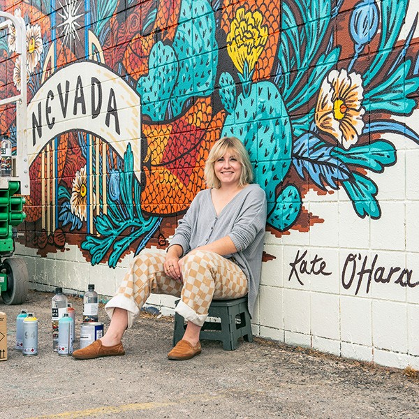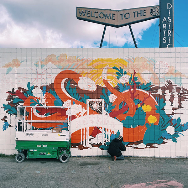 Kate O'Hara與 LIFEWTR 合作設(shè)計(jì)了一個(gè)代表她家鄉(xiāng)內(nèi)華達(dá)州及其對(duì)他有意義的水瓶。我們還根據(jù)瓶子的設(shè)計(jì)組合了一套不同的商品,包括頭巾、別針、貼片、貼紙和帽子。然后,他們聘請(qǐng)我根據(jù)瓶子設(shè)計(jì)繪制兩幅壁畫,一幅在里諾大學(xué),另一幅在拉斯維加斯藝術(shù)區(qū)。
