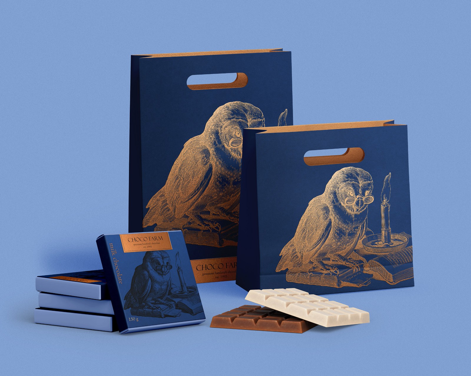 任務(wù)是為白巧克力、牛奶巧克力和黑巧克力以及兩個小紙袋和中號紙袋設(shè)計(jì)一個優(yōu)雅的包裝。業(yè)主的姓氏 Filin 的意思是“貓頭鷹”,這就是我為包裝選擇貓頭鷹插圖的原因。
