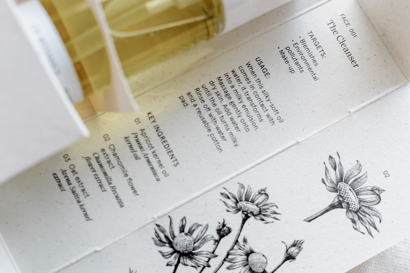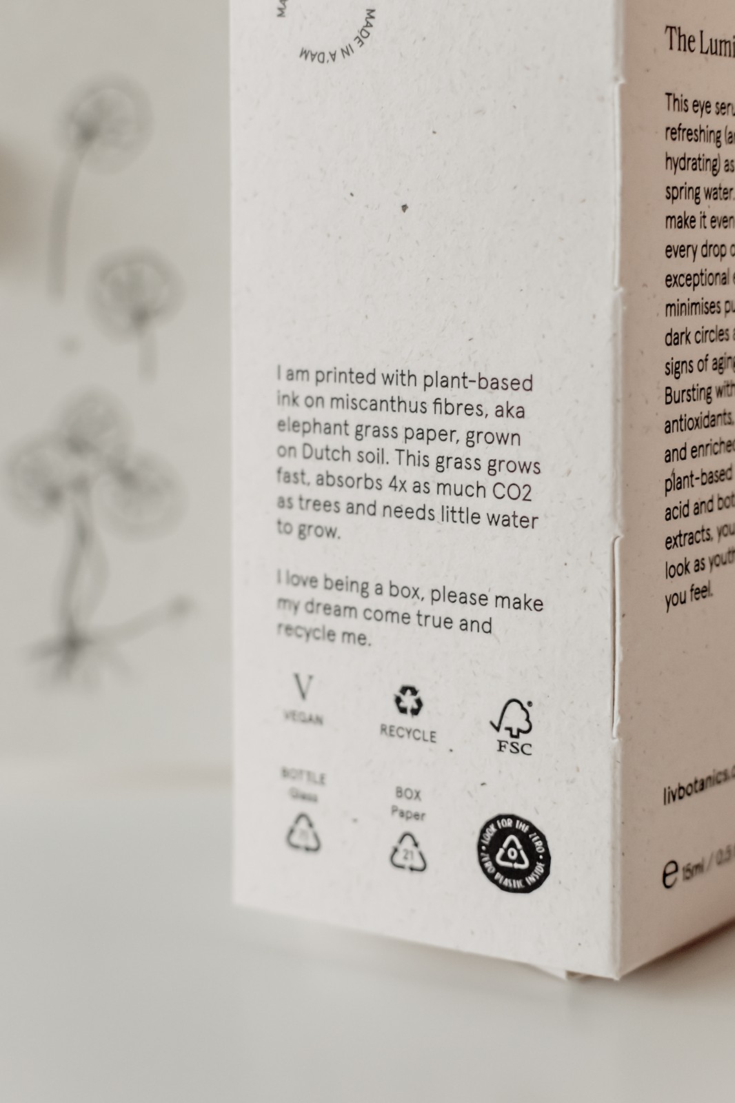 為了最大限度地減少品牌的碳足跡,我們?cè)诰嚯x阿姆斯特丹市幾公里遠(yuǎn)的大象草纖維上使用植物基無(wú)毒墨水進(jìn)行本地印刷。主包裝盒不使用膠水,展開(kāi)平展,展示每種產(chǎn)品中包含的關(guān)鍵成分的植物圖及其植物名稱(chēng)和信息。用于瓶子和罐子的標(biāo)簽不含塑料,而用于運(yùn)輸?shù)亩?jí)包裝、紙帶和包裝紙是 100% 可回收和可回收的,并使用無(wú)毒的植物性油墨印刷。