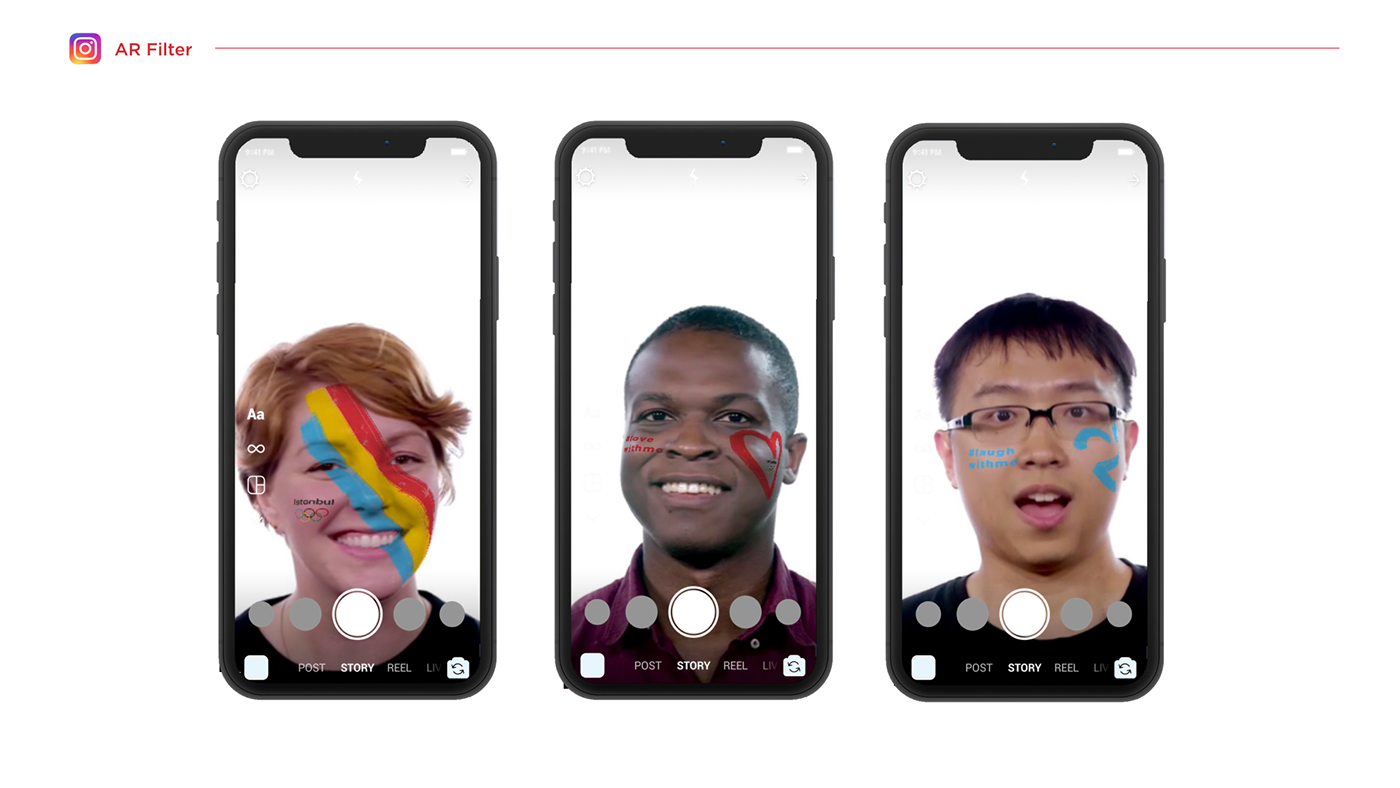 在創(chuàng)建的 Instagram 過(guò)濾器中,我們看到參加奧運(yùn)會(huì)的觀眾以不同形式的口號(hào)與我同行。