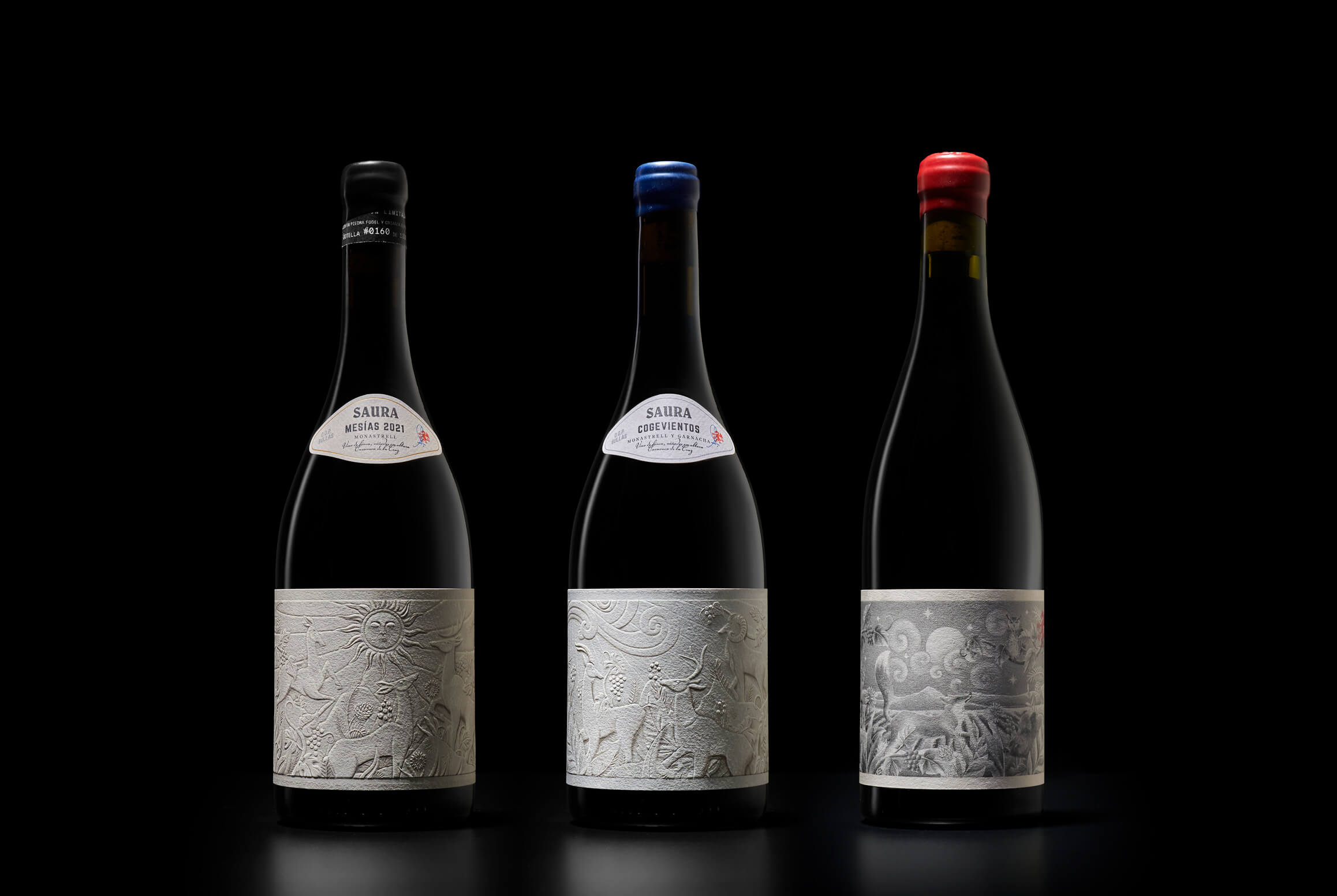 最特別的限量版,以Mesías的名字命名,將每個編號的瓶子標記在其帶上,以傳統(tǒng)的方式用密封蠟密封軟木塞。該家族由三款葡萄酒組成,分別是梅西亞斯(Mesías)、科格維恩托斯(Cogeventos)和考羅文圖姆(Cauro Ventum)。頂部范圍的區(qū)別在于顏色的密封以及石頭的輕微變暗。該系列的入口葡萄酒Cauro Ventum以更具插圖的敘事方式反映了其新鮮度,摒棄浮雕,同時又不失地方的魅力。