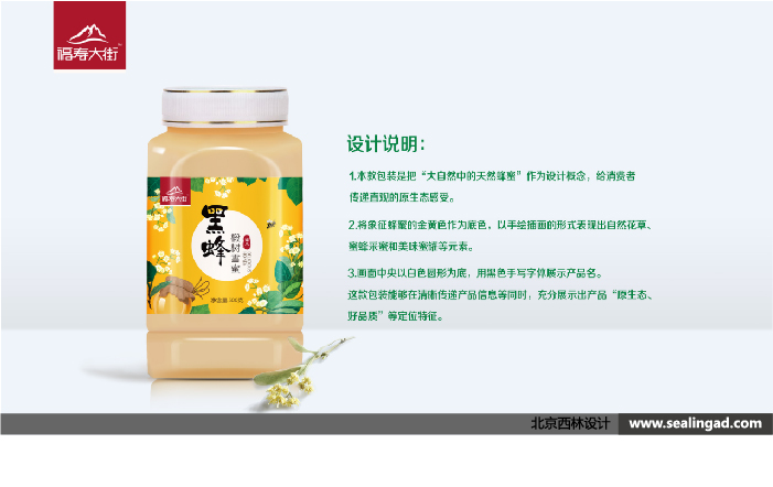 1.包裝把“大自然中的天然蜂蜜”作為設(shè)計(jì)概念,給消費(fèi)者傳遞直觀的原生態(tài)感受。