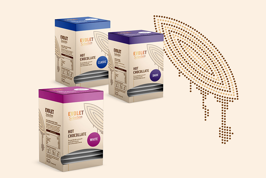 Evolet的選擇范圍是與口號(hào)“選擇與激情”一起開(kāi)發(fā)的。關(guān)心茶樹(shù)生長(zhǎng)的農(nóng)民的熱情。我的創(chuàng)造性解決方案是向消費(fèi)者展示善良的根源,葉,不是客觀化的,而是藝術(shù)的,葉子給你的心情,愛(ài)和對(duì)茶的熱情。這個(gè)想法是為了表達(dá)喝一杯好茶的真實(shí)感覺(jué)。在熱巧克力飲料系列中,茶葉被純可可豆所取代。
