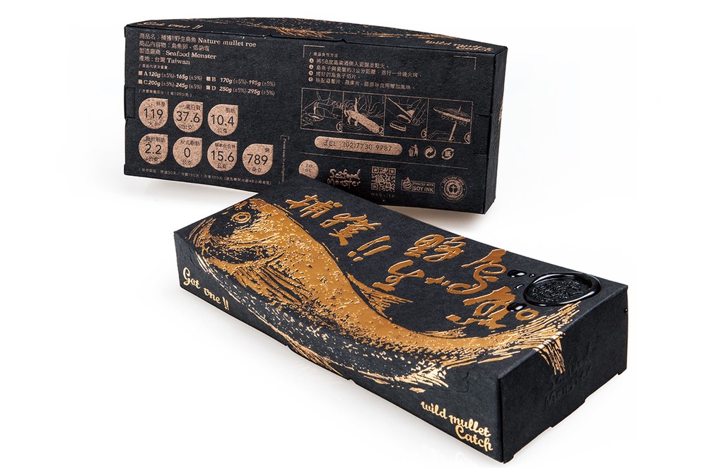 野生烏魚因其黑色背面而得名,因?yàn)榕_(tái)灣的“吳”一詞有“黑”的意思。在冬季,每年都是野生烏魚的季節(jié),沿海的漁村被鋪上曬干的烏魚魚子的金色光芒所覆蓋。這就是為什么烏魚魚兒也被稱為海中的黑色黃金的原因。這意味著它對臺(tái)灣和中國大陸的烏魚產(chǎn)業(yè)所具有的經(jīng)濟(jì)地位?!俺尸F(xiàn)的一種烏金的視覺,劉經(jīng)緯以魚拓藝術(shù)形式將產(chǎn)烏魚的形體,在視覺上非常的突出。他這套包裝讓臺(tái)灣文化與民眾生活躍上國際視線。曾獲得2015的紅點(diǎn)獎(jiǎng)。