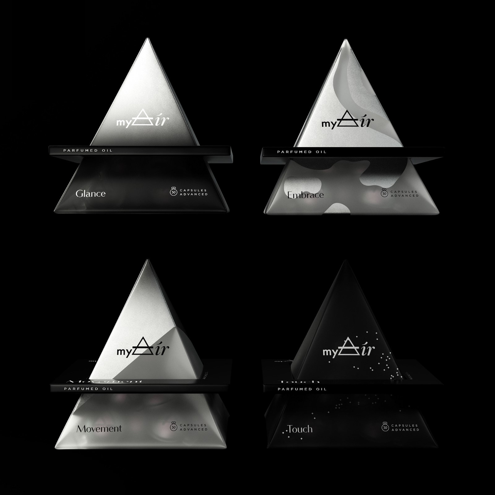 十字三角形象征煉金術(shù)中的“空氣”元素。標(biāo)志是存在于標(biāo)志,它也已轉(zhuǎn)化為金字塔的建設(shè)與膠囊。它使香水的概念,作為個人的空氣,完全體現(xiàn)在項(xiàng)目的每一個細(xì)節(jié)。