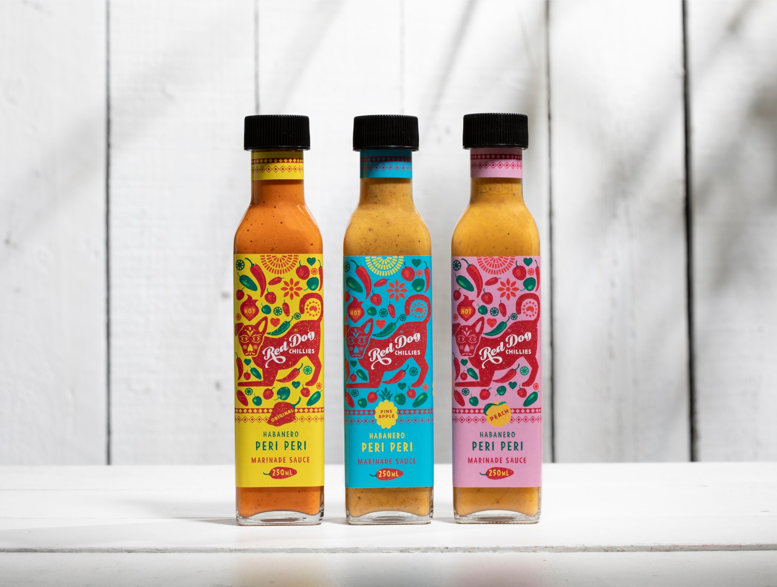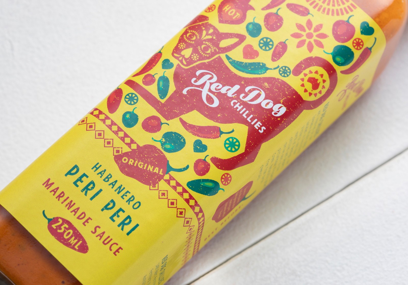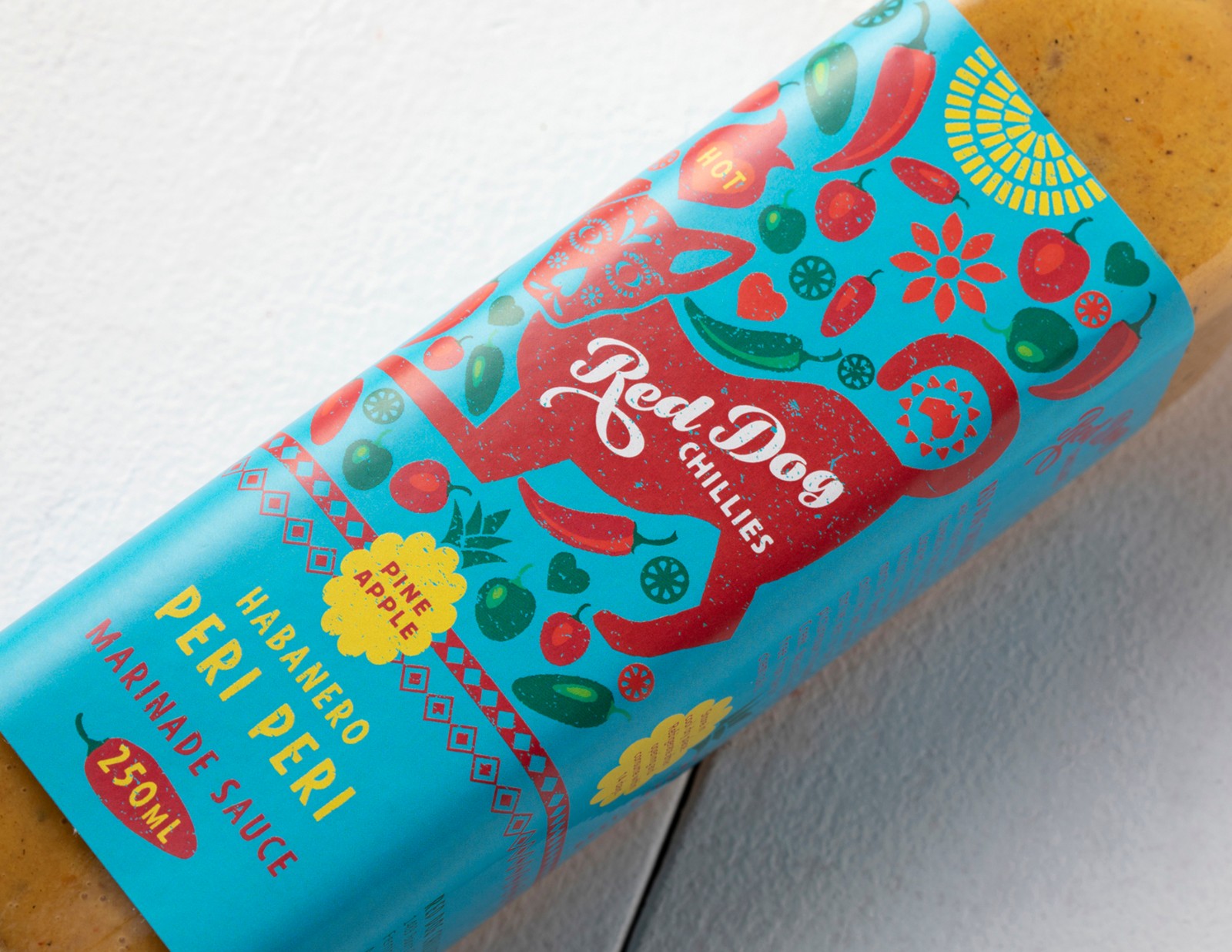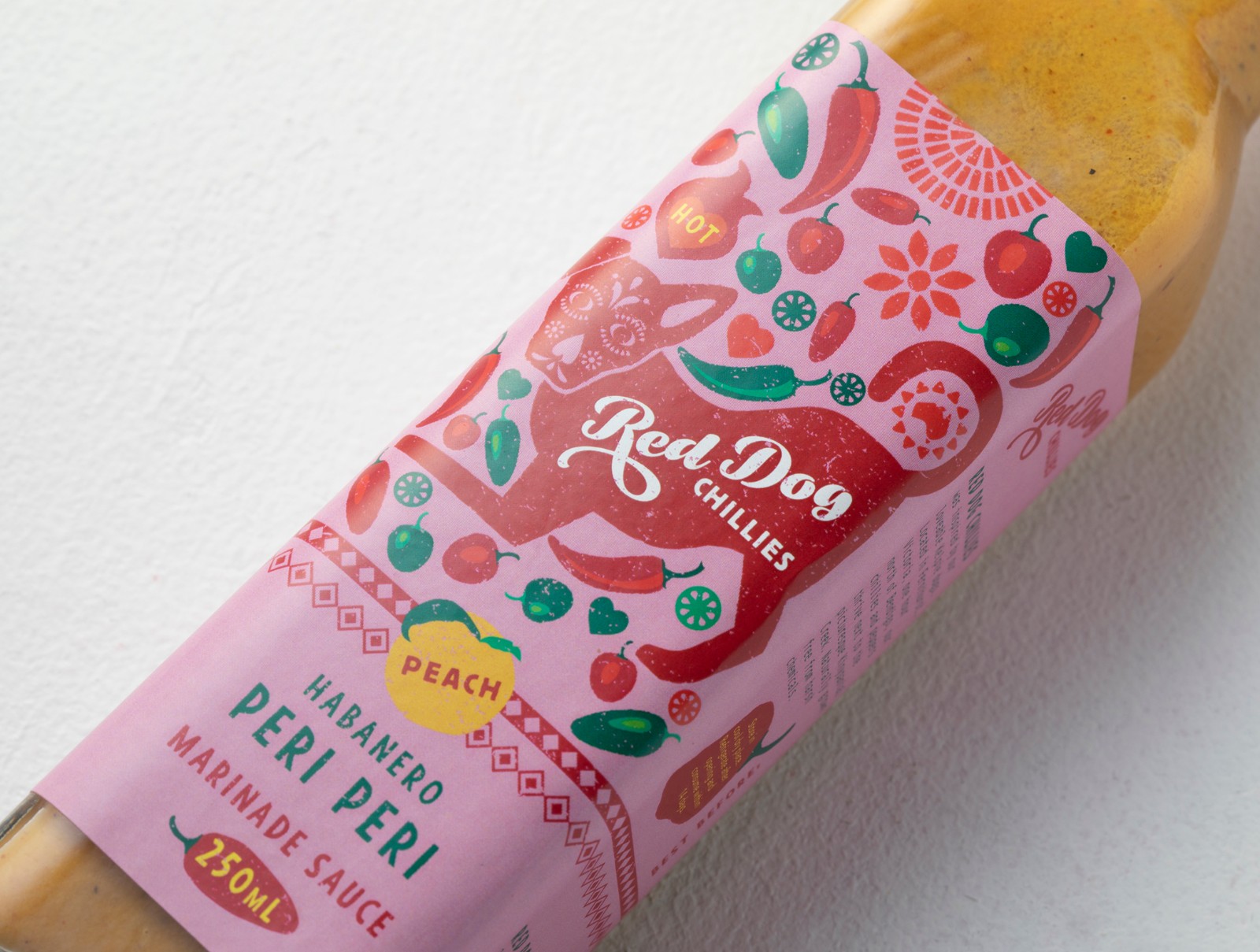 紅狗辣椒(Red Dog Chillies)需要重塑品牌,以展示其優(yōu)質(zhì)產(chǎn)品并吸引新的消費(fèi)者興趣。他們的老品牌并沒有傳達(dá)出店內(nèi)真實(shí),炙手可熱的美味。為了與墨西哥風(fēng)味的辣醬和墨西哥胡椒保持一致,我們采用了墨西哥的“街頭食品”主題。他們心愛的“紅狗”蜿蜒在農(nóng)場(chǎng)周圍,在標(biāo)簽上占據(jù)著中心位置。紅狗上裝飾著“死亡之日”口罩,標(biāo)簽上散布著許多品種的辣椒。該標(biāo)簽還有其他故事講述的圖像–太陽,這是辣椒成功生長(zhǎng)的關(guān)鍵因素,并且以圖形方式傳達(dá)這是澳大利亞的產(chǎn)品。墨西哥設(shè)計(jì)模式增加了墨西哥主題。醬汁范圍內(nèi)共有三種口味,每種口味都有不同的顏色。