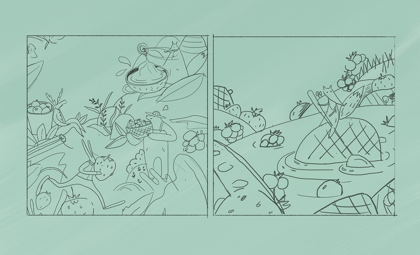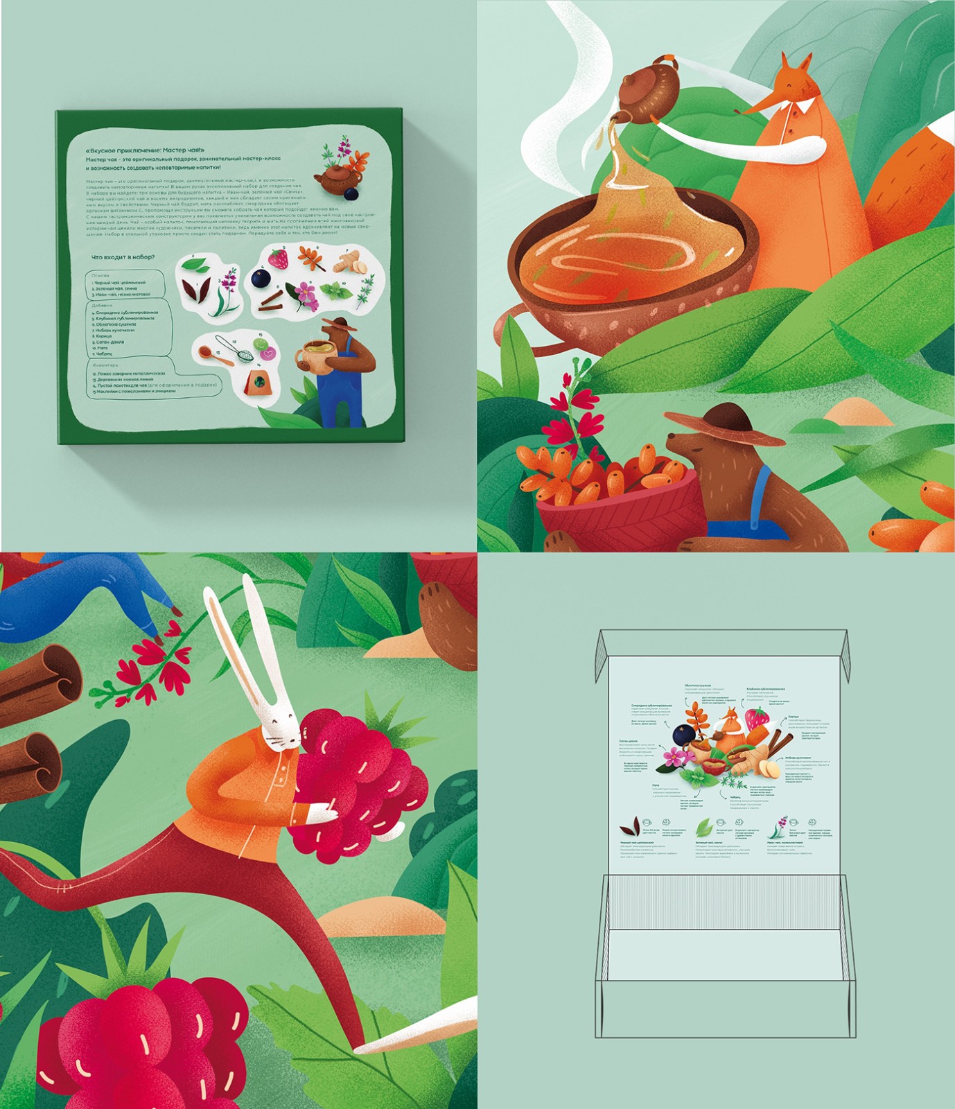 這個(gè)概念的想法是描繪巧克力的制作歷史和茶葉原料的收集歷史。這套是一個(gè)禮物,所以我想讓它盡可能的明亮有趣,因?yàn)橹饕馁I家是父母。