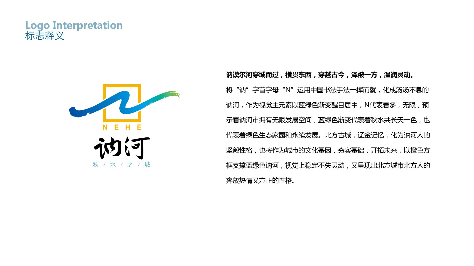 訥河城市品牌形象設(shè)計(jì)創(chuàng)意釋義:訥謨爾河穿越而過,橫貫東西,穿越古今,澤被一方,溫潤(rùn)靈動(dòng)。我們將“訥”字首字母[N]運(yùn)用中國(guó)書法手法一揮而就,化成湯湯不息的訥河,作為視覺主元素以藍(lán)綠色漸變醒目居中,N代表著多,無限,預(yù)示著訥河擁有無限發(fā)展空間,藍(lán)綠色漸變代表著秋水共長(zhǎng)天一色,也代表著綠色生態(tài)家園和永續(xù)發(fā)展。北方古城,遼金記憶,化為訥河人的堅(jiān)毅性格,也將作為城市的文化基因,夯實(shí)基礎(chǔ),開拓未來,以橙色方框支撐藍(lán)綠色訥河,視覺上穩(wěn)定不失靈動(dòng),又呈現(xiàn)出北方城市北方人的奔放熱情又方正的性格。
