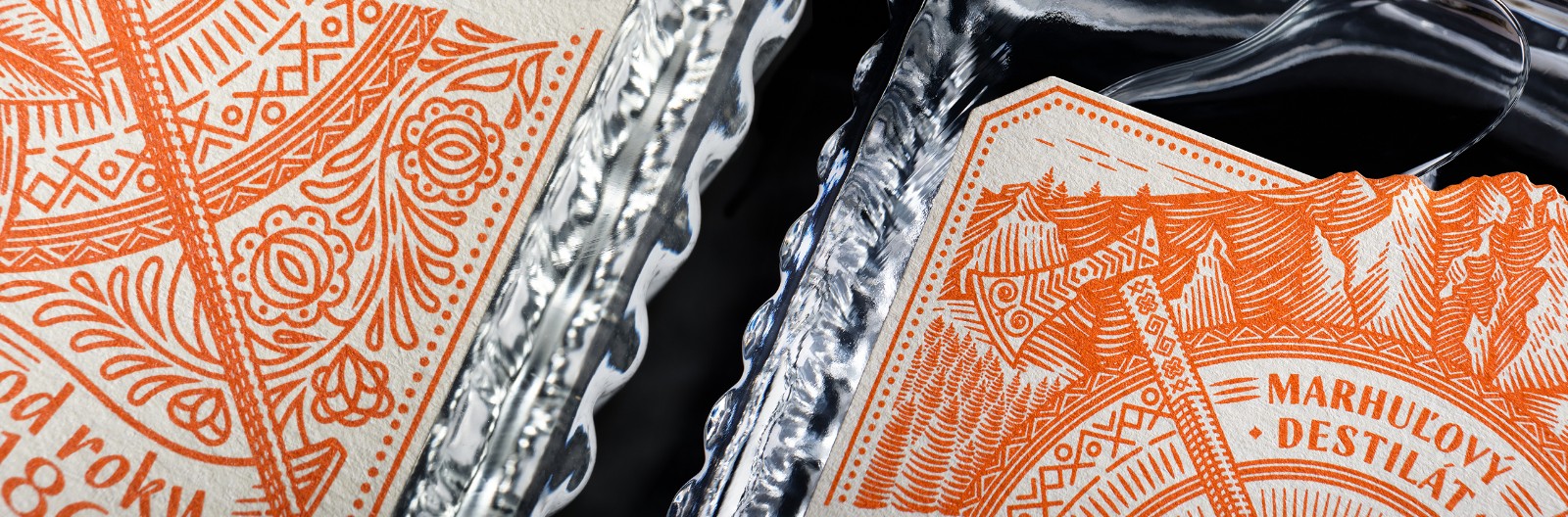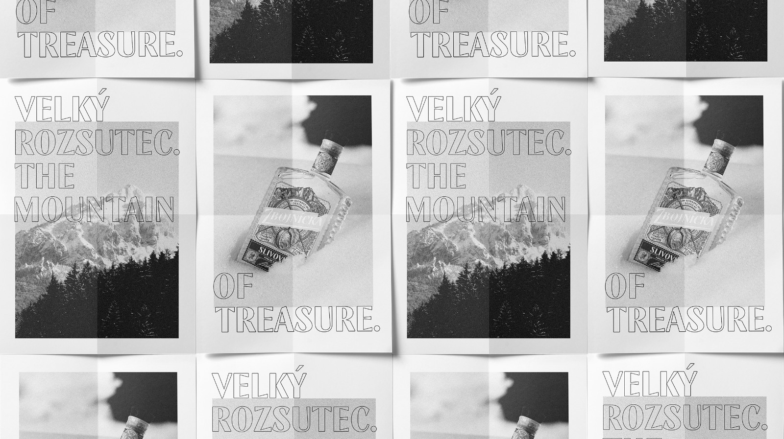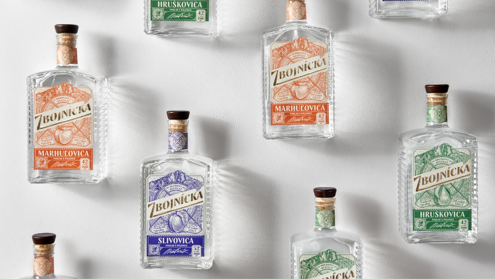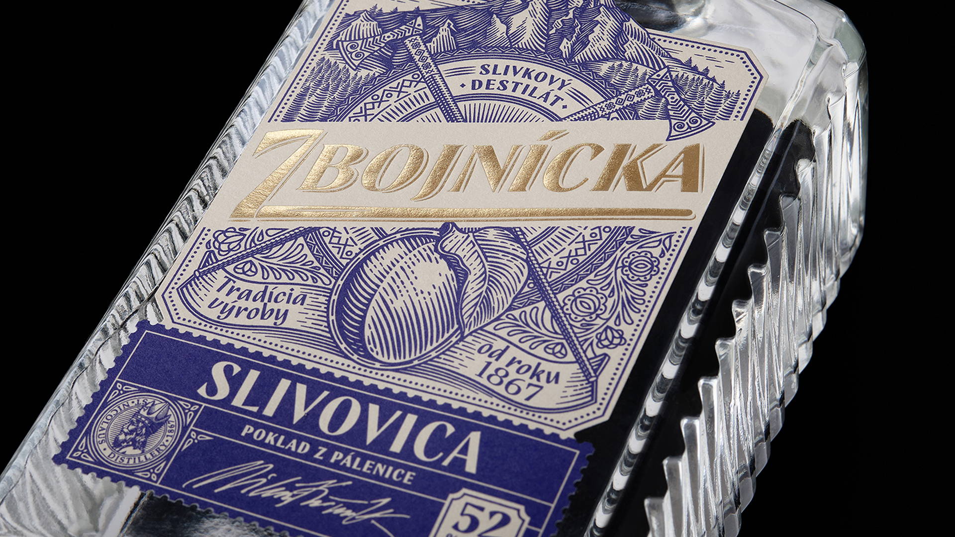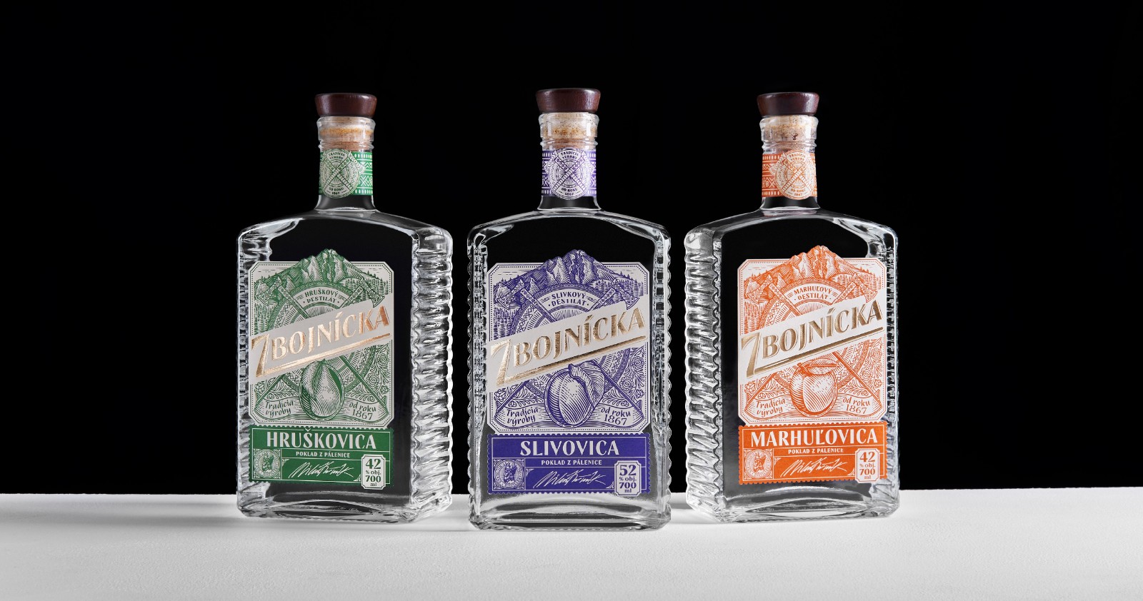 我們選擇了質(zhì)地柔軟的冰霜紙,以喚起一種天然的、自制的產(chǎn)品的感覺。雕刻風(fēng)格的插圖創(chuàng)造了一種被轉(zhuǎn)移到過去的印象。Zbojníks使用的十字牧羊人斧頭和一個(gè)飾以Mala Fatra地區(qū)傳統(tǒng)裝飾品的盾牌被放置在標(biāo)簽的中央。它們共同象征著Zbojníks人的特征--他們好戰(zhàn)的本性,愿意戰(zhàn)斗和保護(hù)他們的珍寶。標(biāo)簽的頂部是著名的韋爾克羅祖特克山的雕刻插圖,根據(jù)傳說,這里藏有許多珍寶。這種來自不同地區(qū)的斯洛伐克裝飾品的組合,增強(qiáng)了一個(gè)真正的本地,傳統(tǒng)產(chǎn)品的形象。