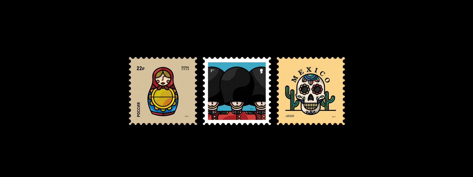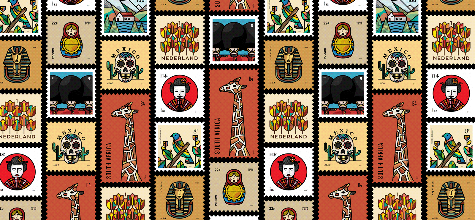 郵票設計我們一直認為它是小海報設計,方寸間自有天地。今天分享的這位設計師他選擇各種郵票插圖與布局。在設計這個系列時,他(她)的靈感來自擁有的一些對舊郵票系列以及每個獨特地方的特色圖像。由于 covid-19,現(xiàn)在很難環(huán)游世界,但希望暫時可以通過郵票的視覺幫助您至少通過屏幕旅行。