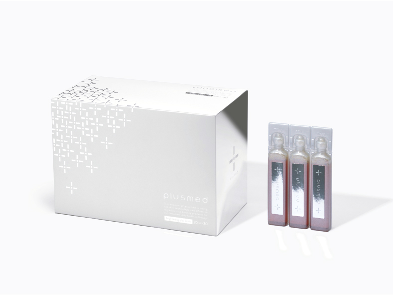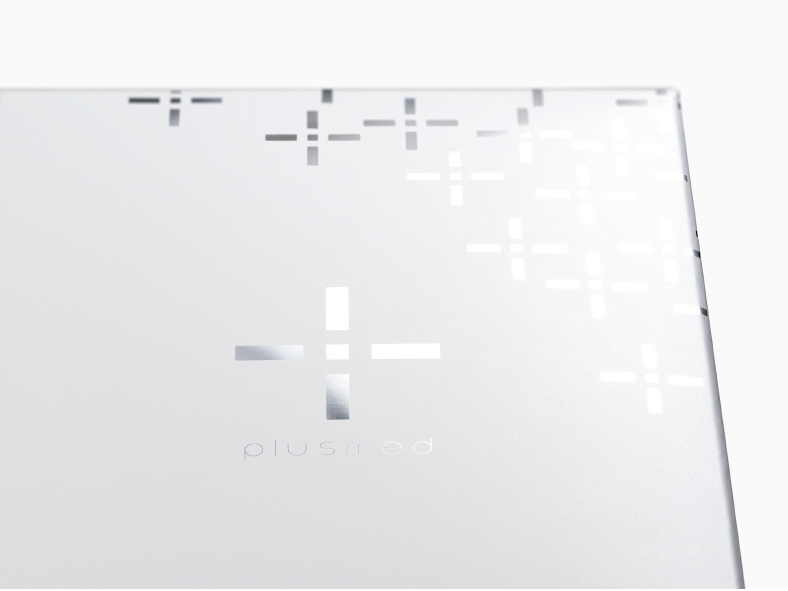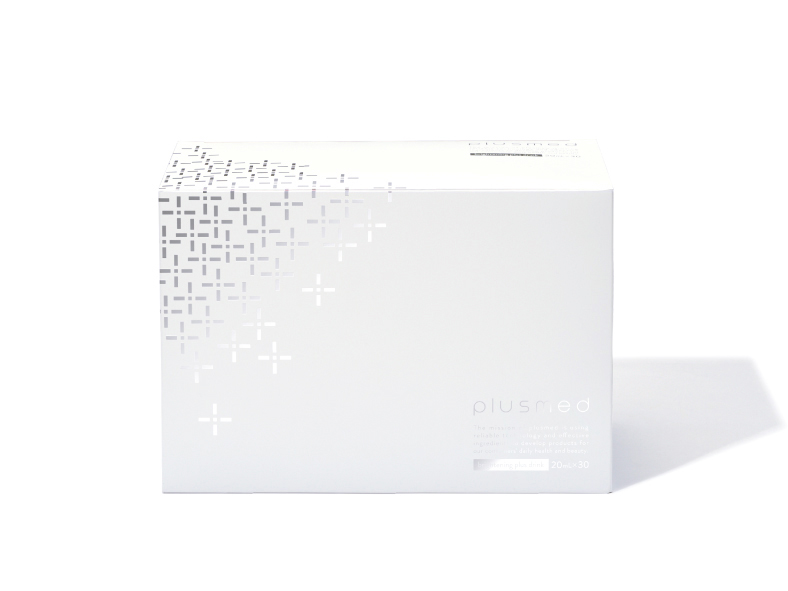 將醫(yī)學十字架創(chuàng)意極簡形態(tài),中間的支點是不變的初心,四條線也有光線的感覺,與醫(yī)學美容行業(yè)相符,PLUSMED美容產(chǎn)品的創(chuàng)意包裝,銀卡紙禮盒,高端清爽,大氣時尚。