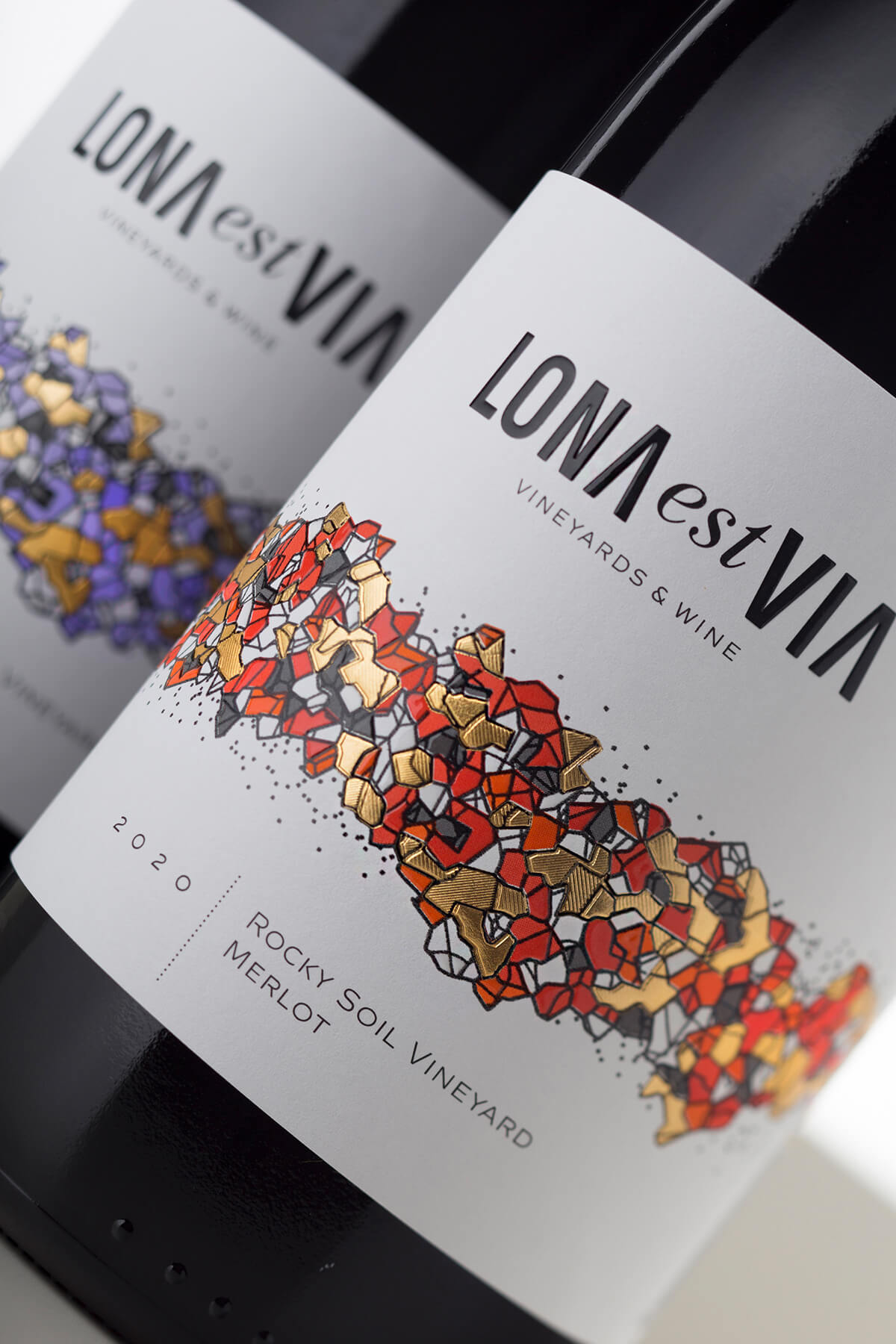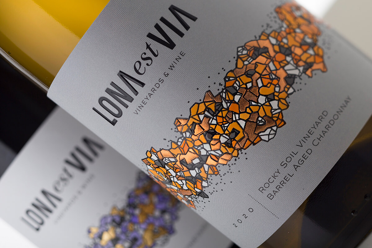 為了增強(qiáng)所有這些反射,我在每塊印有熱箔的石頭上使用了微壓花和強(qiáng)力壓花,而另一個(gè)用墨水印刷的則在上面涂上了凸起的清漆,這樣最后整個(gè)條紋看起來(lái)像一個(gè) 3D 圖像,尤其是在不同的光線條件下. 我的主要想法是在這個(gè)包裝標(biāo)簽中創(chuàng)建非常吸引人的彩色條紋,以便人們可以輕松記住它。我還想大聲說(shuō),這些石頭是 Sredno Gradishte 村周圍這片神奇風(fēng)土的真正寶藏。標(biāo)簽的頂部中心是“LONA est VIA”標(biāo)題,我使用定制的無(wú)襯線字體和藝術(shù)草書字母之間的優(yōu)雅組合來(lái)連接 LONA 和 VIA。我想在這個(gè)酒標(biāo)設(shè)計(jì)上有一個(gè)非常清晰易讀的標(biāo)題,但我不想看起來(lái)很簡(jiǎn)單。