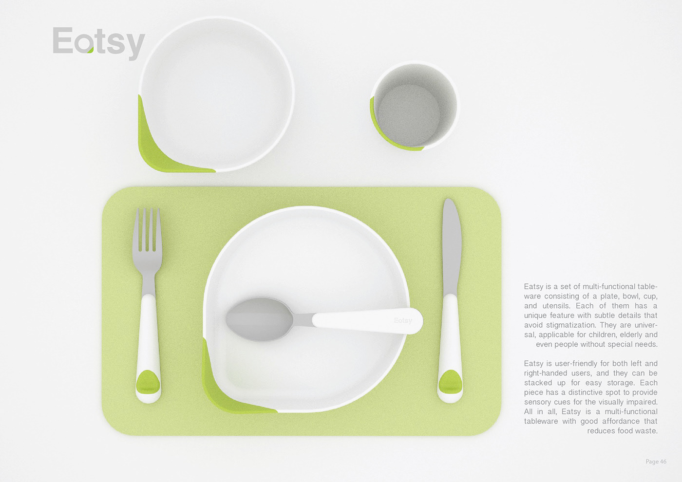 Eatsy 是一套多功能餐具,由盤(pán)子、碗、杯子和餐具組成。他們每個(gè)人都有一個(gè)獨(dú)特的功能,帶有微妙的細(xì)節(jié),可以避免污名化。它們是通用的,適用于兒童、老人甚至沒(méi)有特殊需要的人。Eatsy 對(duì)慣用左手和慣用右手的用戶都非常友好,它們可以疊放起來(lái)以便于存放。