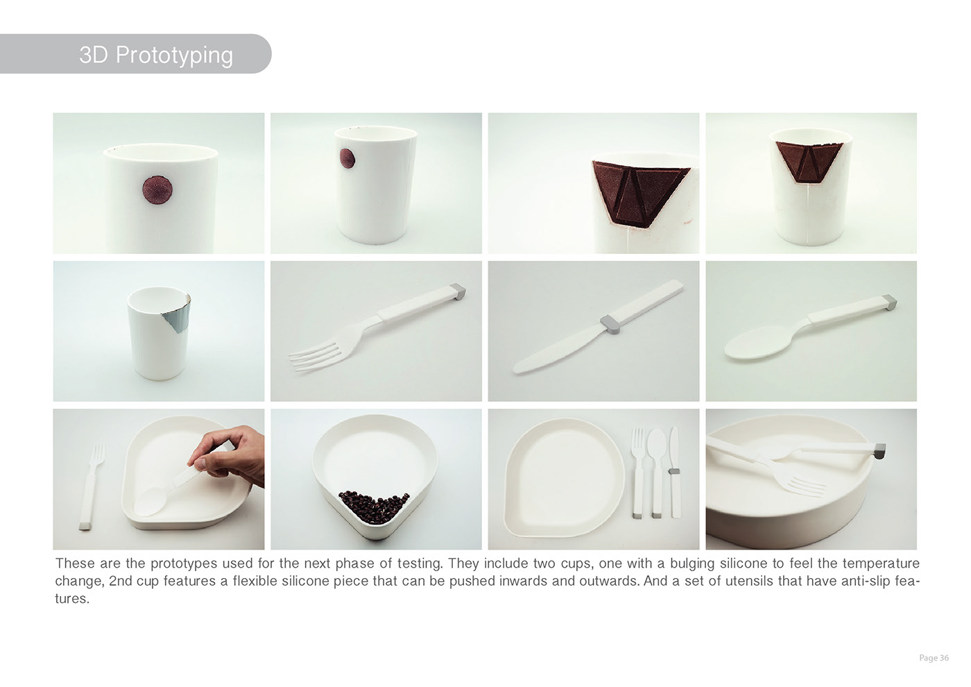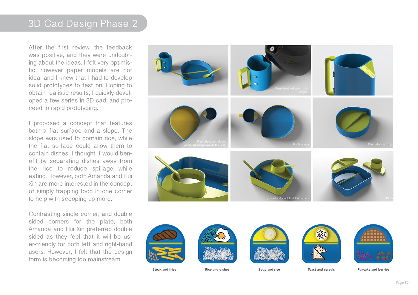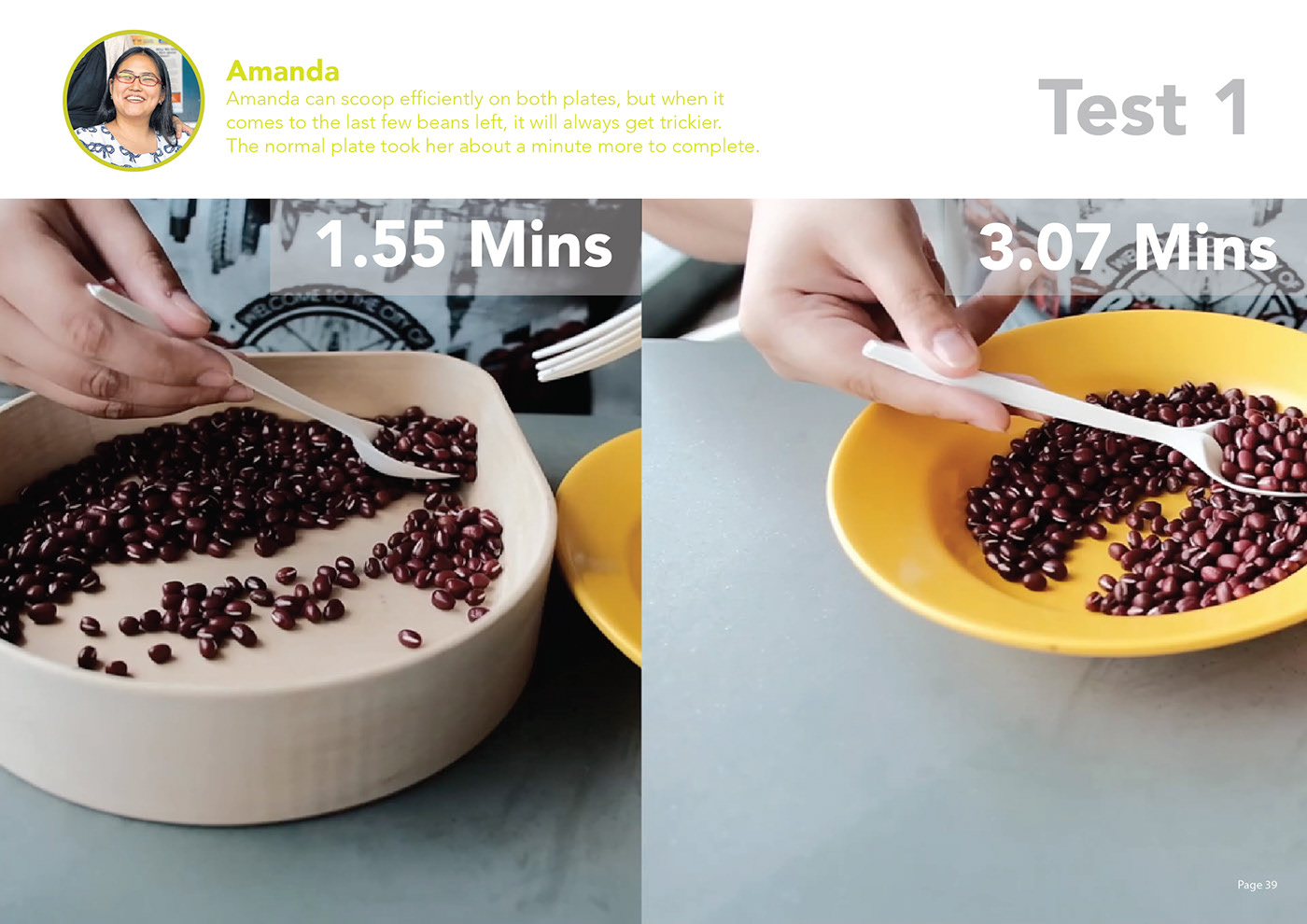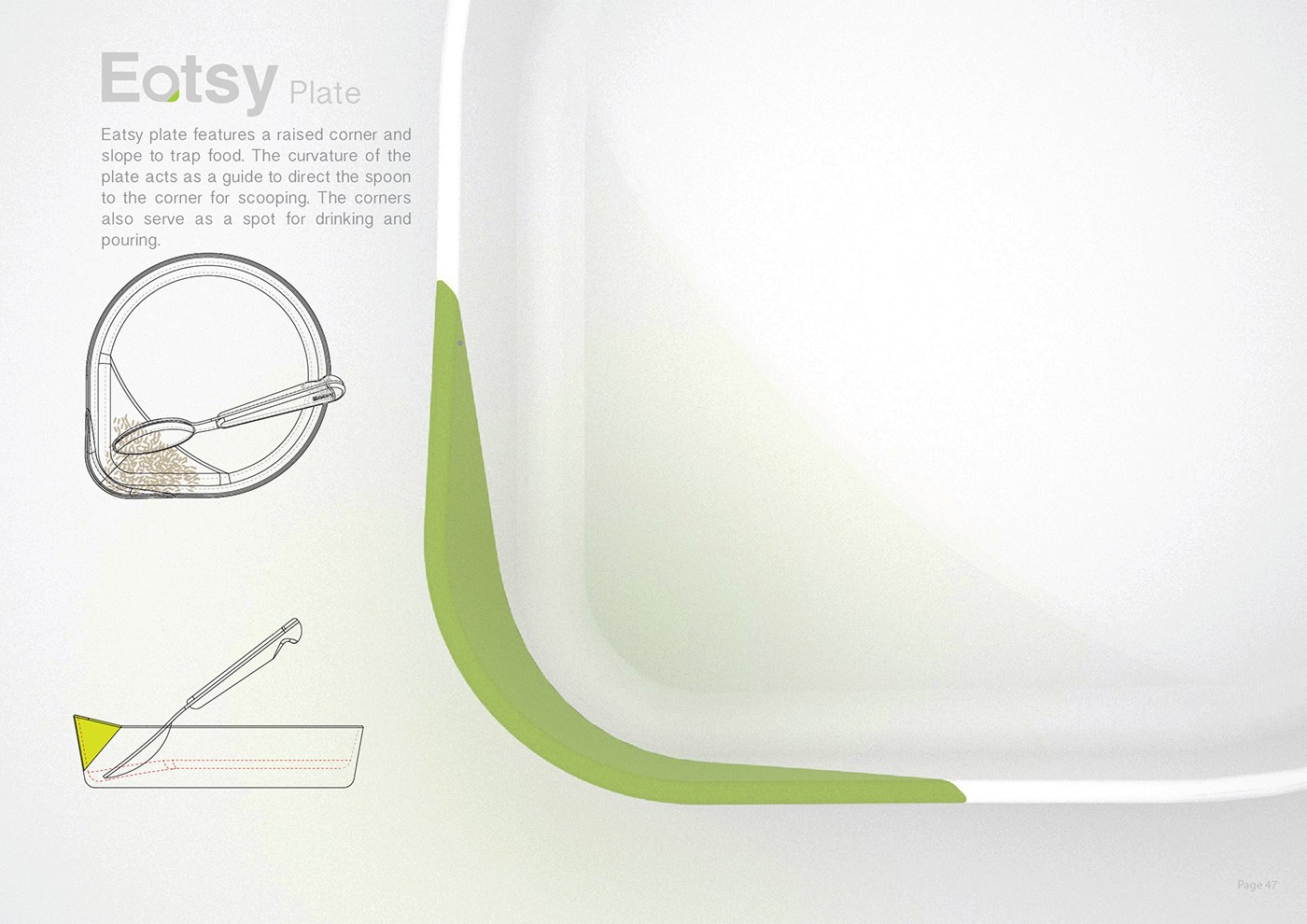 Eatsy 盤(pán)子的特點(diǎn)是有一個(gè)凸起的角落和斜坡來(lái)夾住食物。盤(pán)子的曲率作為引導(dǎo),將勺子引導(dǎo)到角落進(jìn)行舀。角落也可以作為飲用和傾倒的地方。