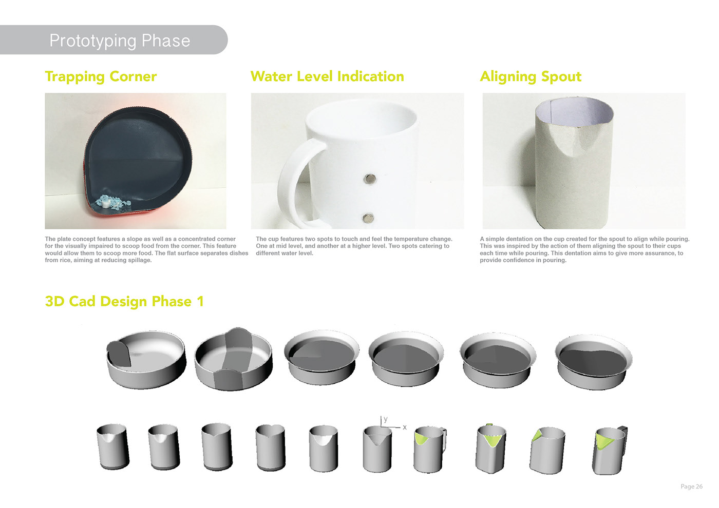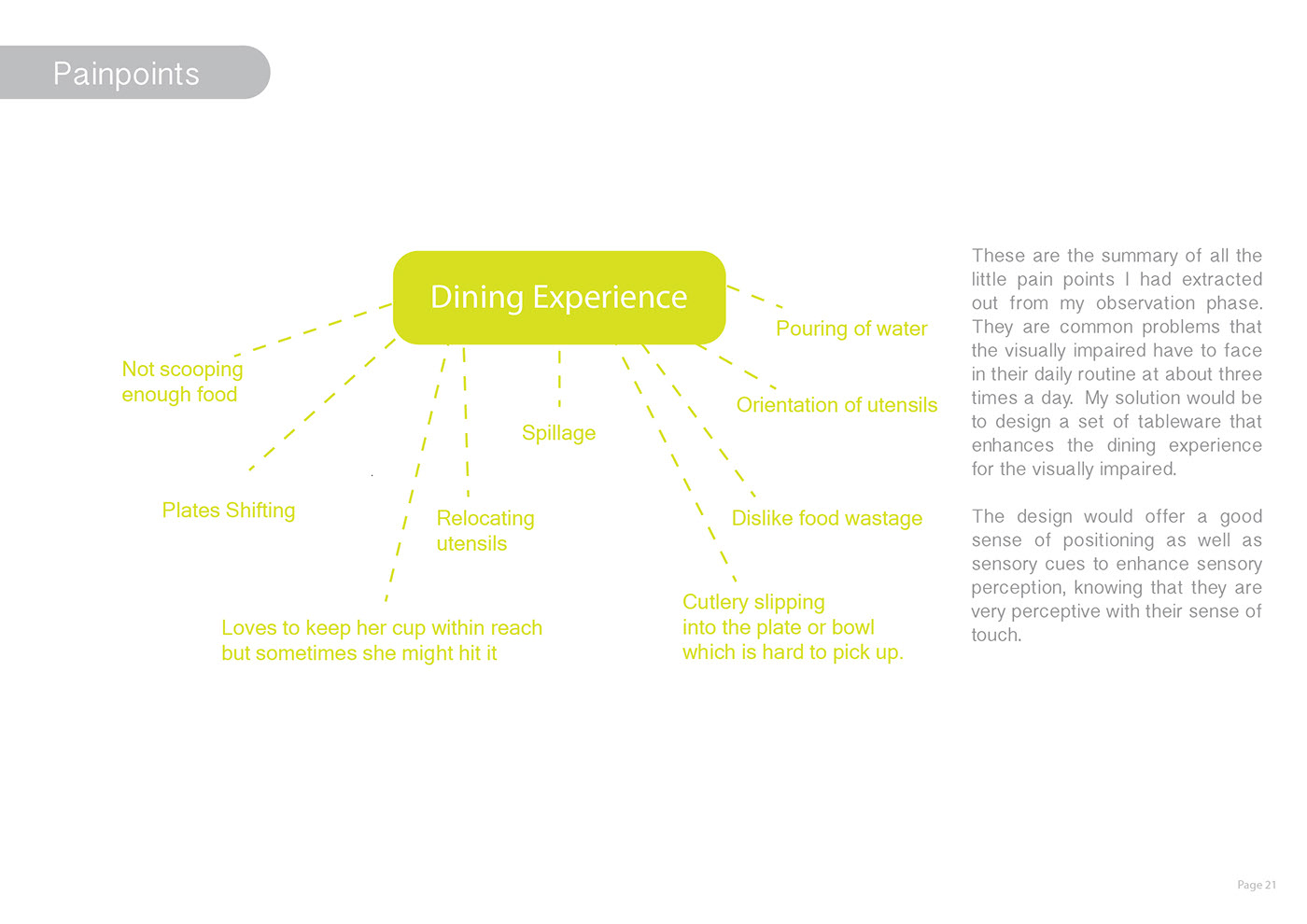 對(duì)于視障人士來(lái)說(shuō),他們無(wú)法用勺子測(cè)量食物的數(shù)量,而且很多未吃的食物通常會(huì)散落在盤(pán)子周?chē)?。此外,在沒(méi)有正確視力的情況下,將水和餐具倒入一碗熱湯中時(shí),壺嘴與杯子的錯(cuò)位是最糟糕的體驗(yàn)。