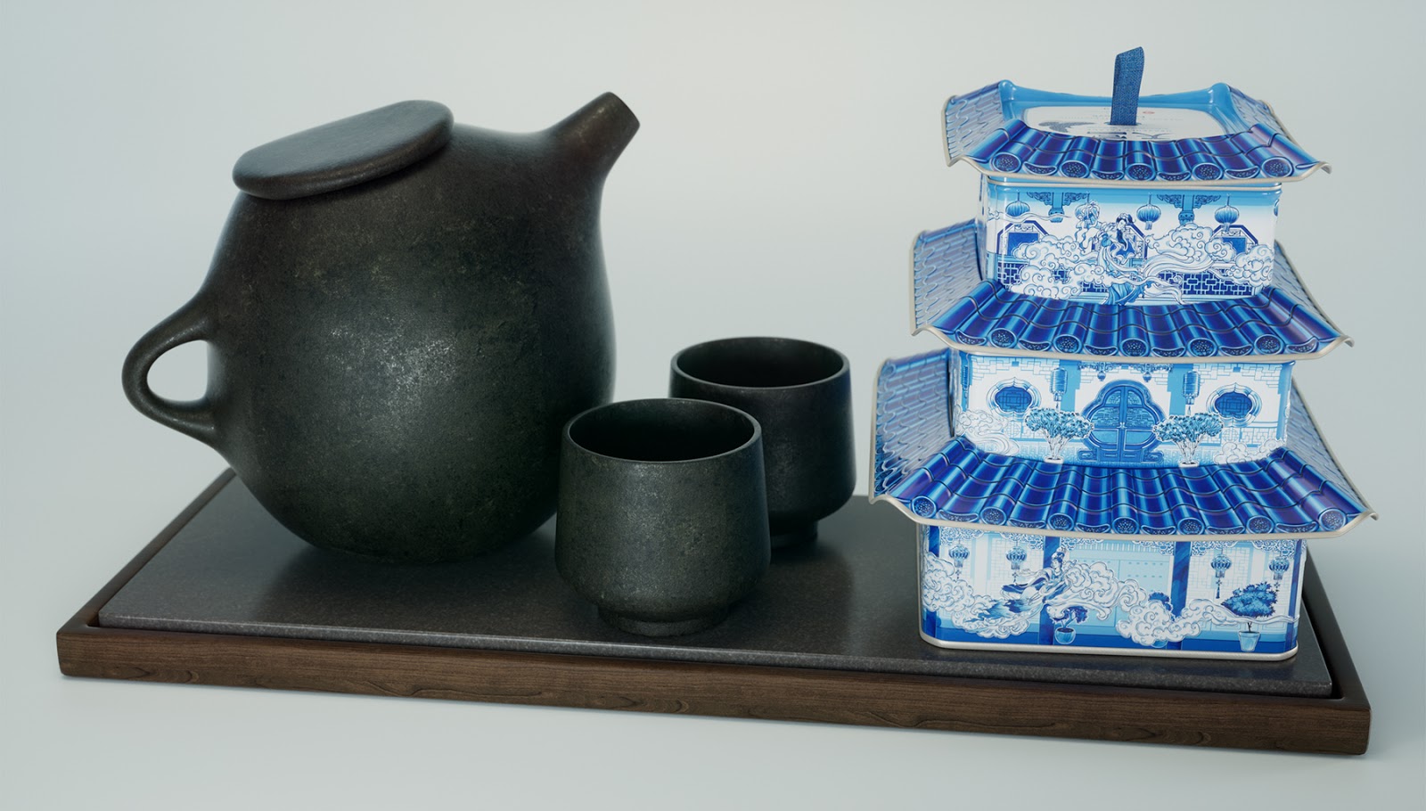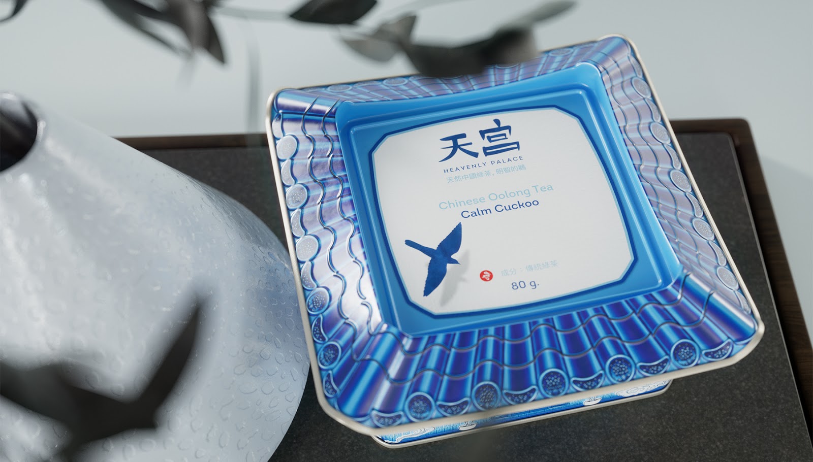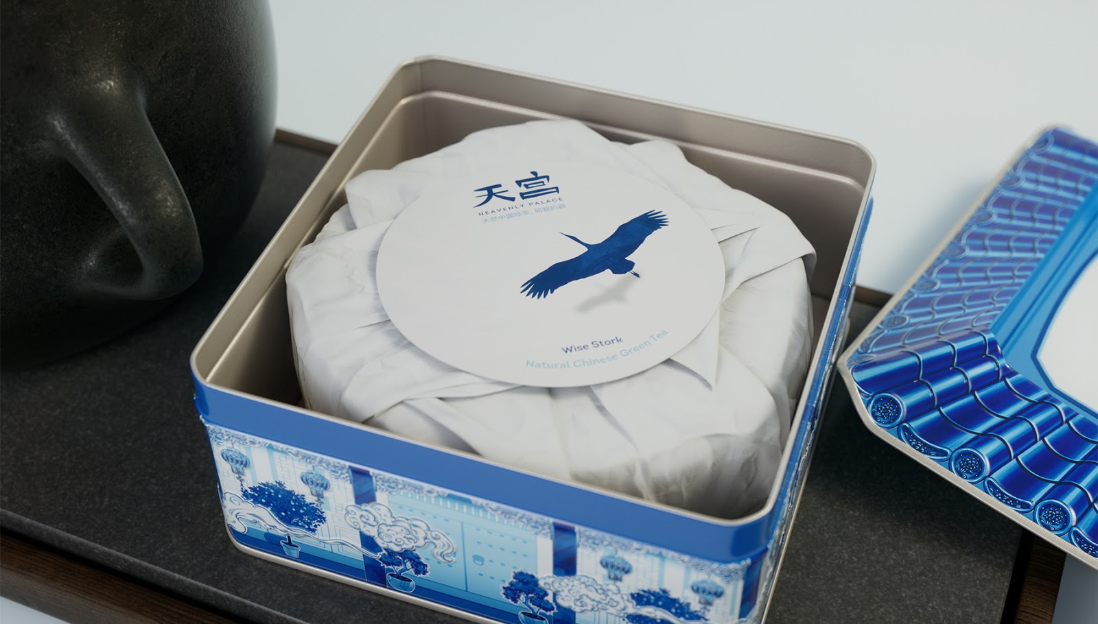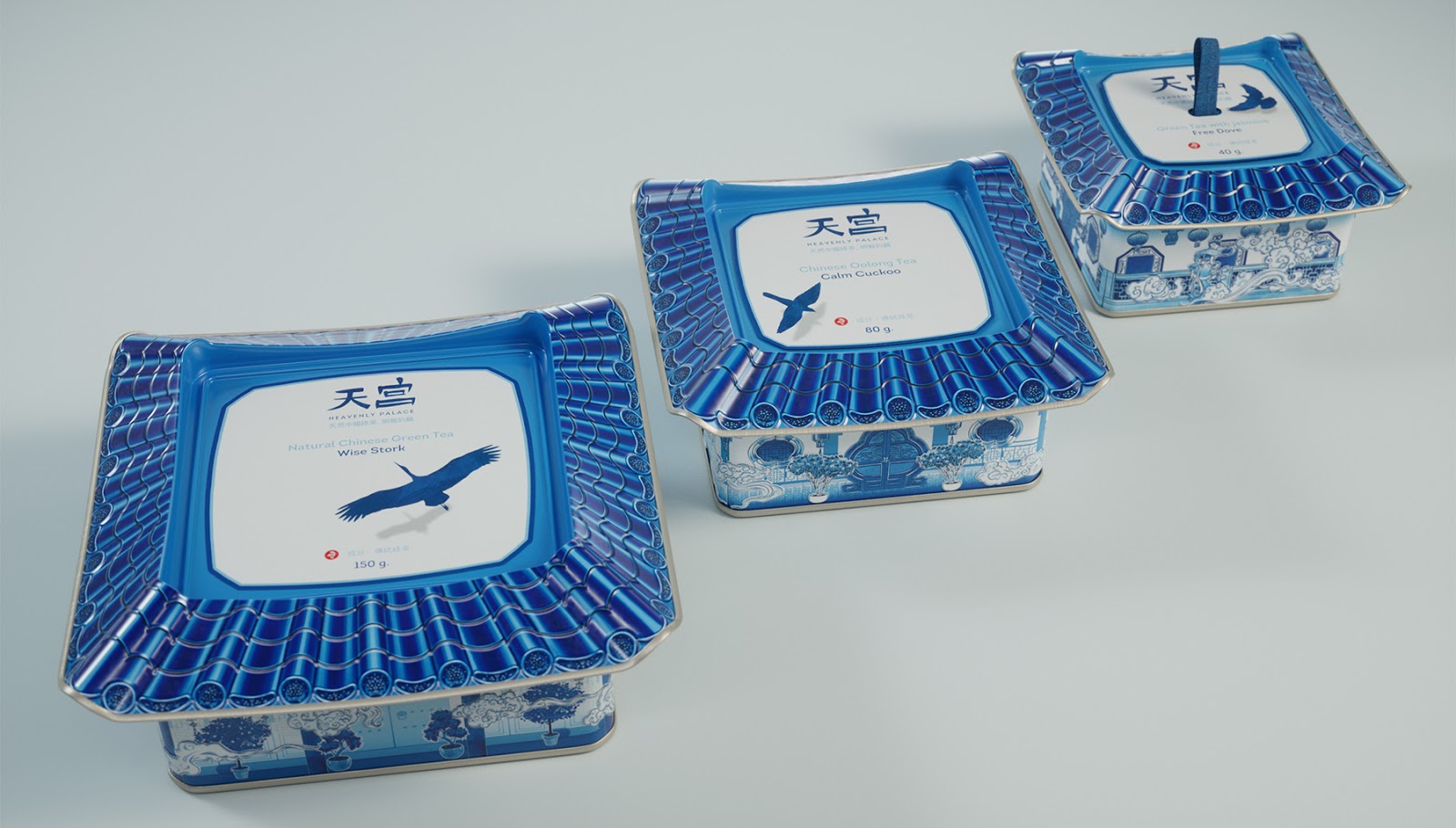 傳統(tǒng)的青花國(guó)風(fēng)為設(shè)計(jì)風(fēng)格,一個(gè)有創(chuàng)意的鐵盒,使他賦予靈魂,設(shè)計(jì)點(diǎn)在于層疊設(shè)計(jì)與天宮的寓意