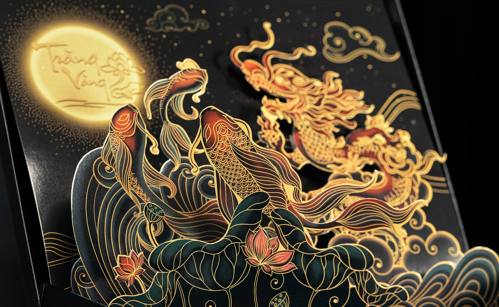 標(biāo)志性的優(yōu)質(zhì)“Tr?ng Váng”月餅不僅包裹在奢華的黑色外殼中,還撒上一層可食用的金粉,并填充奢華的配料。為了體現(xiàn)金氏月餅的最佳工藝,TREE Studios的藝術(shù)作品被用來制作月餅?zāi)>摺J噶繄D也必須進行編輯,以適合成品。對于獨特的激光切割燈箱,切割槽的精度至關(guān)重要。由于它會影響每個燈籠的亮度,復(fù)雜凹槽的尺寸應(yīng)盡可能精確到設(shè)計師的規(guī)格。